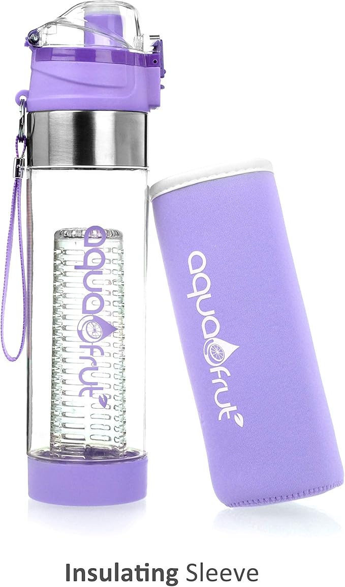 NEW Improved AquaFrut Bottom Loading Fruit Infuser Water Bottle Complete Bundle Includes Bottle Brush, Insulating Sleeve & Infusion Recipe eBook. Leak Proof Sweat Proof BPA-Free (Purple)