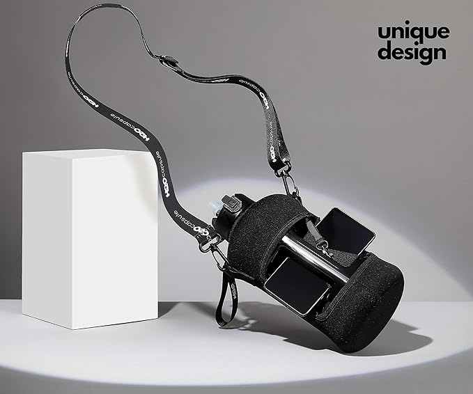 - UNIQUE STORAGE SLEEVE: Using the space under the large jug handle to store your stuff, the patent-pending removable thermal sleeve has a unique design that holds your cards and cell phone, and is finished with an in-built key chain and removable shoulder strap for convenient hands free carrying! It’s the only encased water jug that holds your things while you exercise.