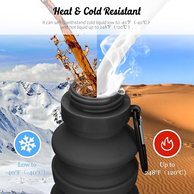 - Portable Design: Collapsible and durable silicone water bottle with carabiner for easy transport.