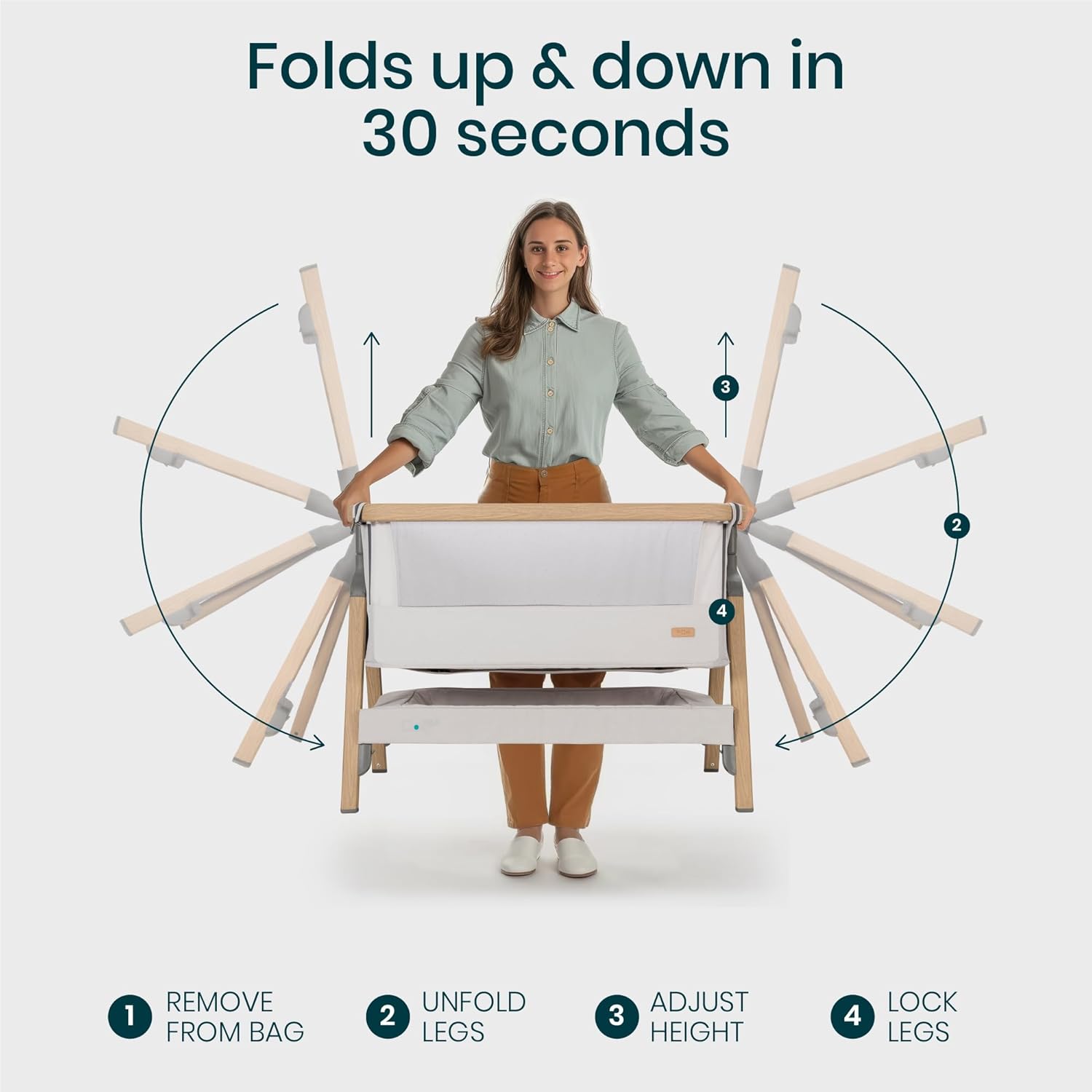 - SET UP IN 30 SECONDS - Thanks to our innovative fast-folding mechanism, the baby bedside bassinet is ultra quick to set up! The wood-effect legs lock securely into place to keep the bedside crib stable.