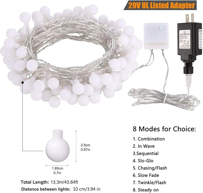 - SAFE TO USE - Premium quality Globe LED light chain with timer and plug, 13m(43ft) long(10m/33ft String Lights, 3m/10ft Lead Wire), 29V low voltage transformer with 7.2W Rated Power. 8 Functions. Come with a UL Certified transformer and operated with low voltage, very safe for use.Perfect for indoor and outdoor decorations(IP44 Waterproof).
