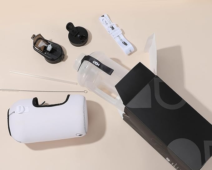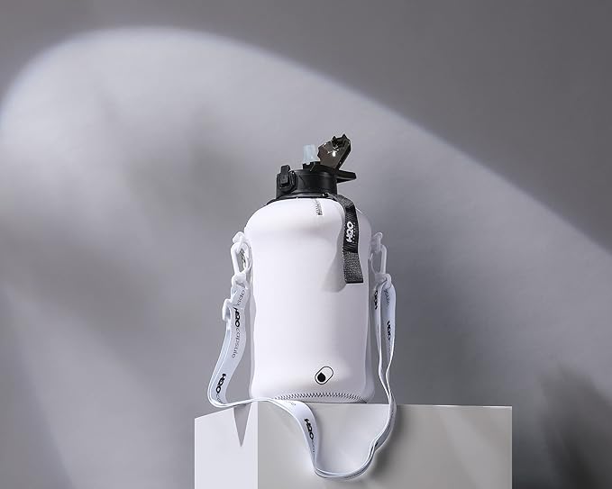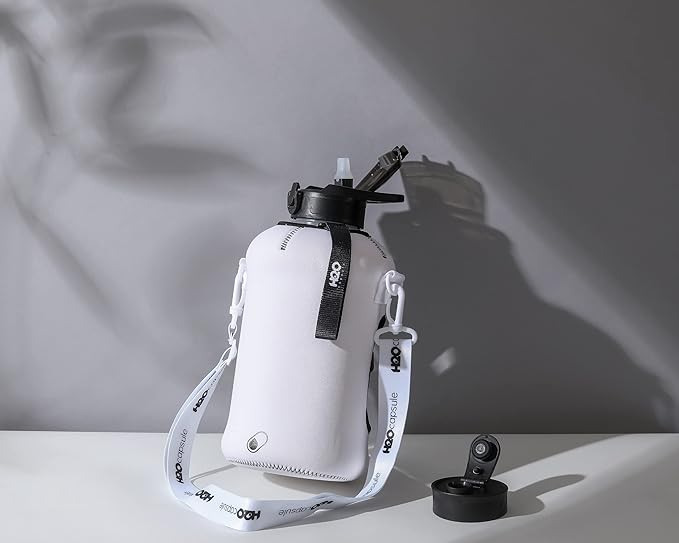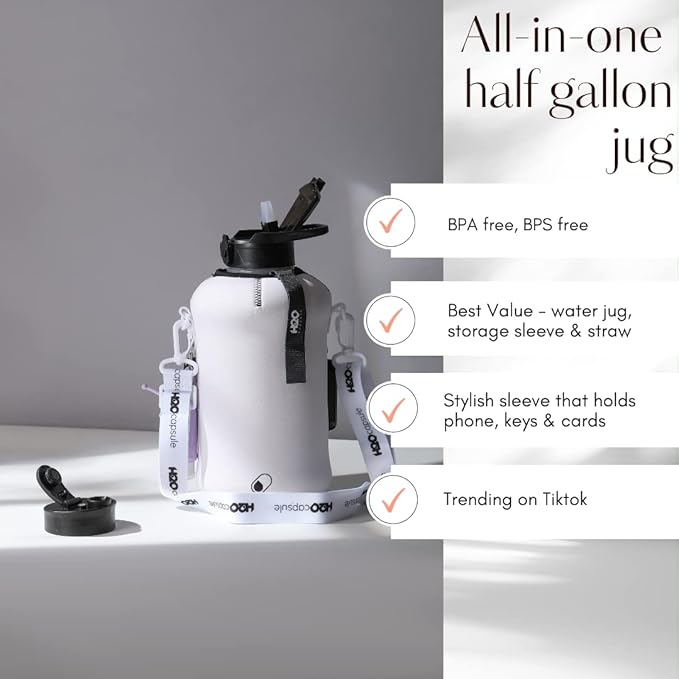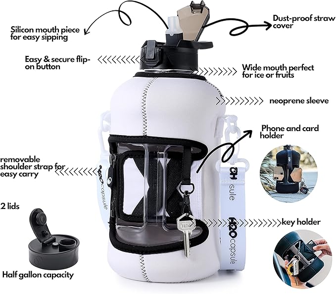 - HALF GALLON HYDRATION WITH COVERED STRAW LID: The extra large 2.2L / 74 oz plastic jug holds all the water you need to stay hydrated while you exercise. The reusable half gallon comes with a leak-proof & dust-proof covered straw lid, which helps protect the mouthpiece and flips open with a click of a button. The straw-lid is air-sealed: Run straw brush through mouth piece before initial use. The H2O Capsule bottle with storage sleeve comes with a bonus straw cleaning brush.