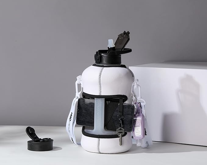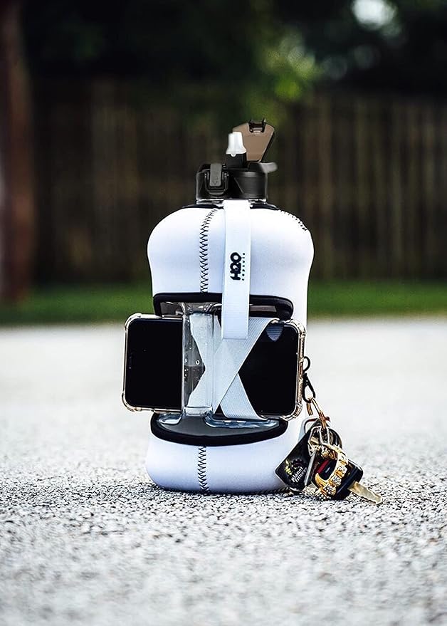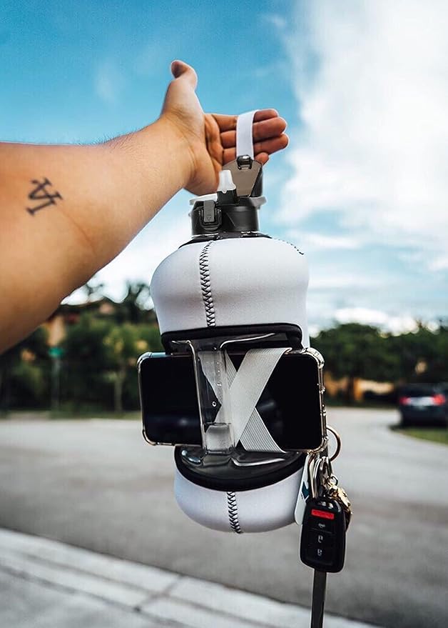 - UNIQUE STORAGE SLEEVE: Using the space under the large jug handle to store your stuff, the patent-pending removable thermal sleeve has a unique design that holds your cards and cell phone, and is finished with an in-built key chain and removable shoulder strap for convenient hands free carrying! It’s the only encased water jug that holds your things while you exercise.