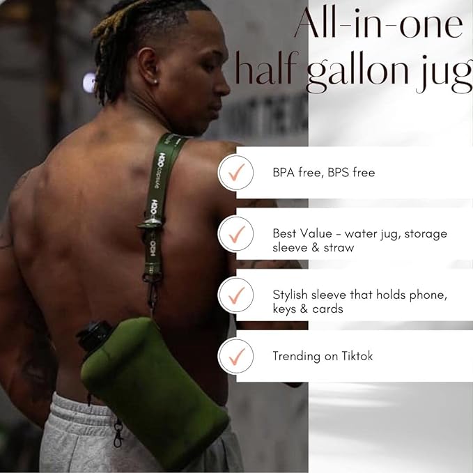 - UNIQUE STORAGE SLEEVE: Using the space under the large jug handle to store your stuff, the patent-pending removable thermal sleeve has a unique design that holds your cards and cell phone, and is finished with an in-built key chain and removable shoulder strap for convenient hands free carrying! It’s the only encased water jug that holds your things while you exercise.