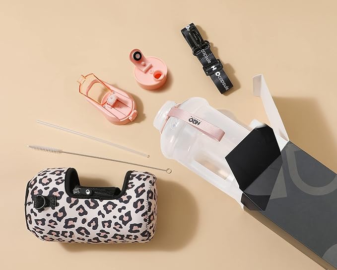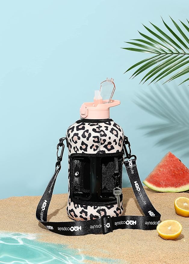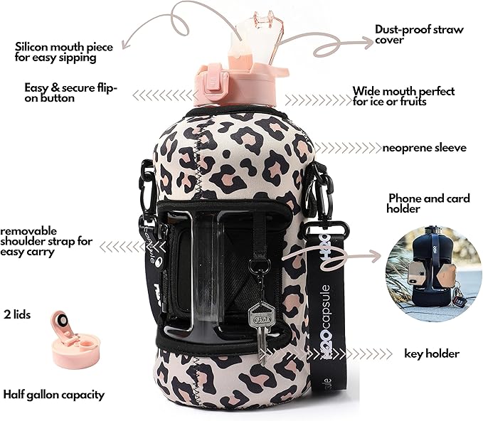 - HALF GALLON HYDRATION WITH COVERED STRAW LID: The extra large 2.2L / 74 oz plastic jug holds all the water you need to stay hydrated while you exercise. The reusable half gallon comes with a leak-proof & dust-proof covered straw lid, which helps protect the mouthpiece and flips open with a click of a button. The straw-lid is air-sealed: Run straw brush through mouth piece before initial use. The H2O Capsule bottle with storage sleeve comes with a bonus straw cleaning brush.