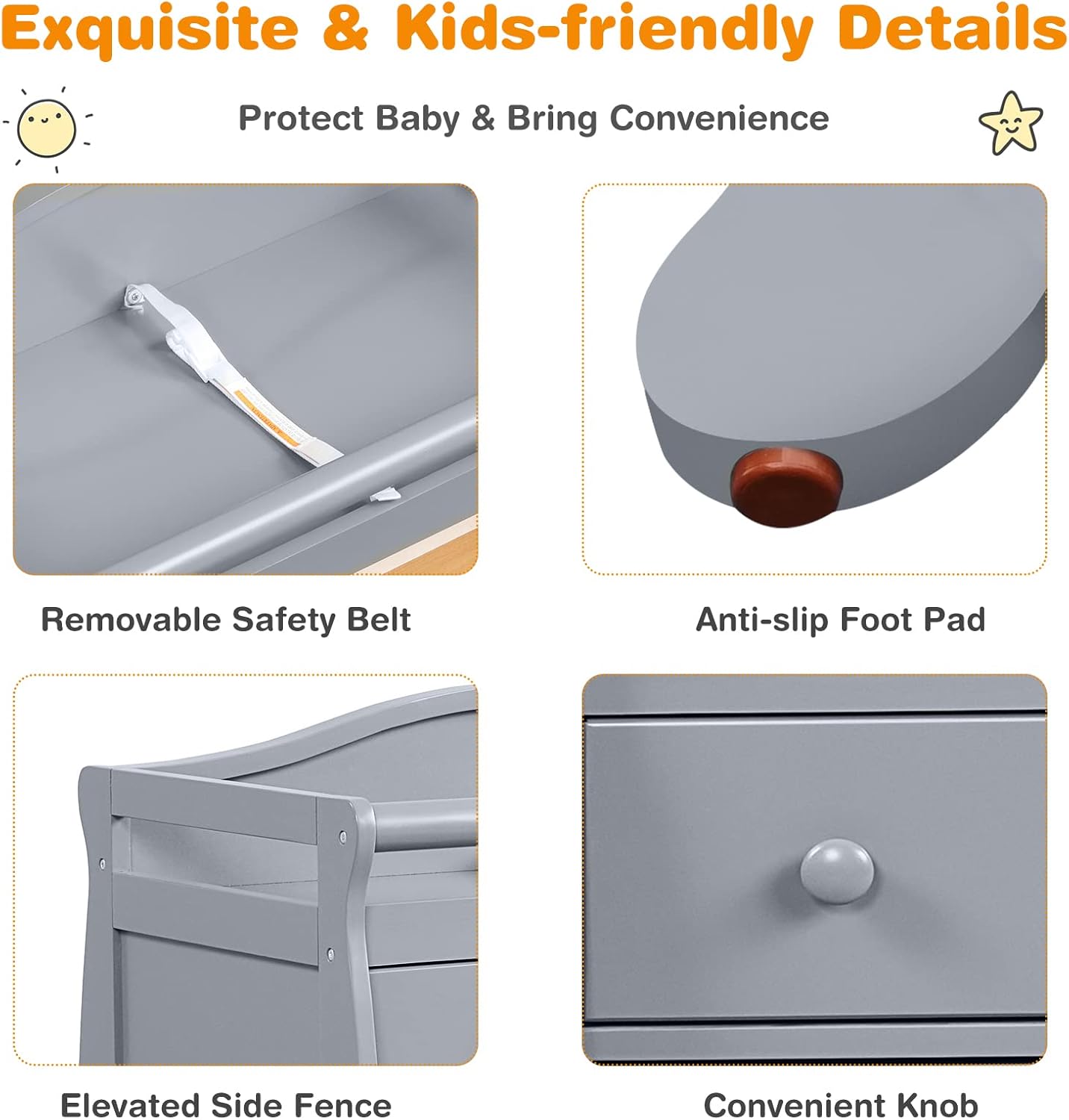 - Convenient Changing Area: Since the dresser chest is designed with changing topper, babies will have a safe and wide space to have their clothes or diapers changed. Meanwhile, its customized height will free parents from frequent bending over and help relieve fatigue of back and waist.