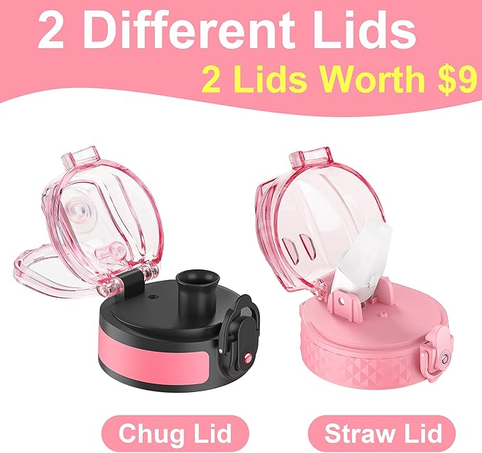 OLDLEY Kids Water Bottle for School with Straw Chug Lid, 15 oz Unbreakable Leak-Proof BPA-Free Motivational Water Bottles with Time Marker for Travel Sports Gym, 2 Lids, Candy Pink/Blueberry