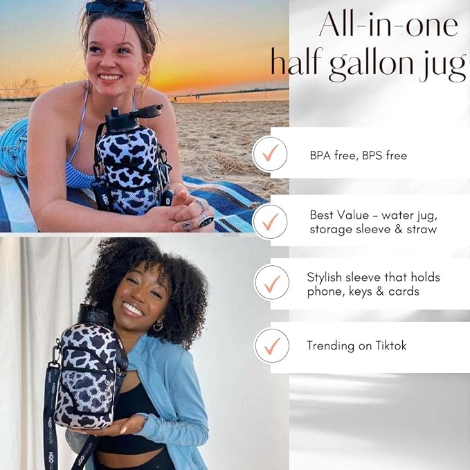 - HALF GALLON HYDRATION WITH REMOVABLE STRAW: The extra large 2.2L / 74 oz hydro jug holds all the water you need to stay hydrated while exercising. The reusable jug has a 2.25” wide mouth perfect for ice cubes, and removable straw for easy drinking.