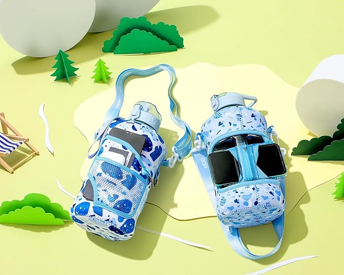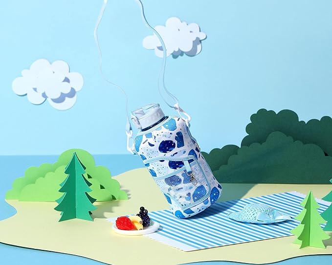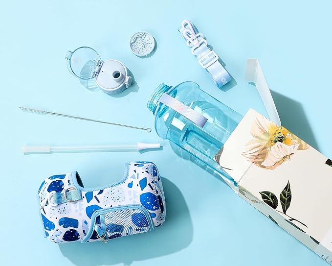 H2O Capsule 2.2L Half Gallon Water Bottle with Storage Sleeve and Removable Straw – BPA Free Large Reusable Drink Container with Handle - Big Sports Jug, 2.2 Liter (74 Ounce), Blue Collage