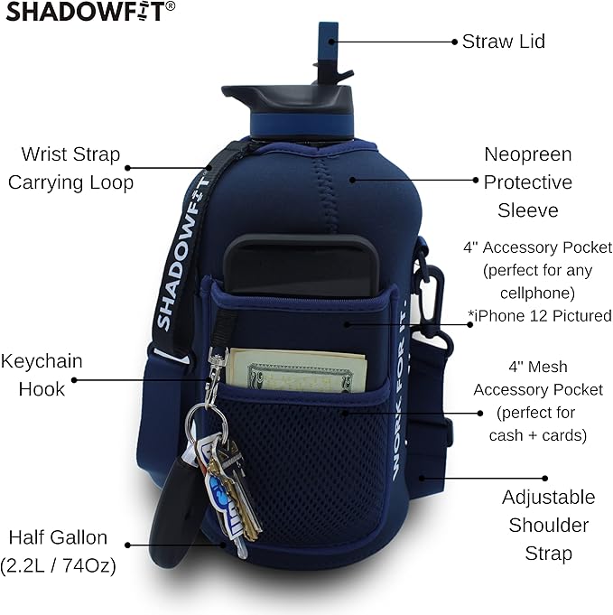 - Designed for a Great Workout: Our ShadowFit team wants you to be able to focus on getting in your best workouts! We have designed these large water bottles to not only keep you fully hydrated, but to create ease at the gym and during your outdoor fitness activities like hiking, biking, running, and sports. You can carry it around by the built-in handle, removable strap, or wrist-strap carrying loop while storing your keys, cell phone, cash, and cards.