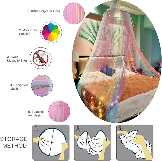 - ❖ CANOPY PACKAGE _ Packaged with a 8-Function Remote Control Lights Curtain(3 meters 250 lights), powered by USB, and the warm white light reflected on the rainbow bed canopy, it will looks more dreamy at night, like a Princess' Rainbow Castle! Best Bed Canopy for Girls!