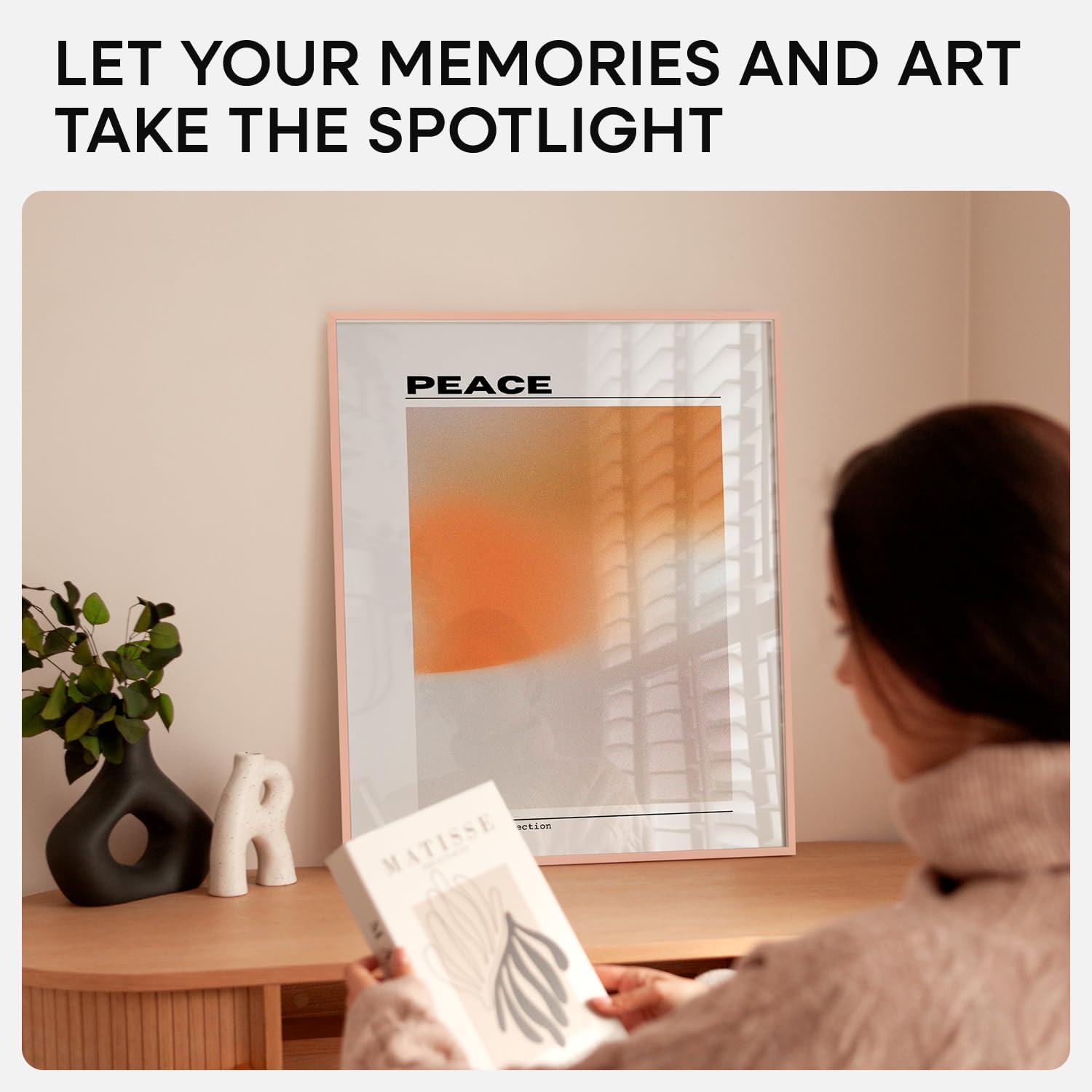 - ROSE GOLD. SOFT GLOW. This aluminum frame features a muted rose finish with a satin texture. It brings gentle contrast to light walls and softens modern interiors with a hint of warmth.