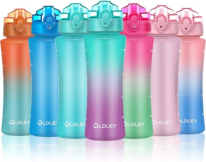 OLDLEY Kids Water Bottle with Straw 15 oz BPA-Free Leak-Proof Motivational Water Bottles with Time Marker for School Sports Travel Gym, Easy to Use for Girls Goys, 1 Straw Lid, Mint Purple