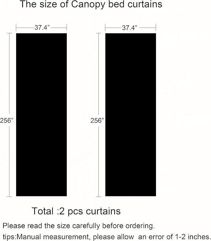- Size detail:37.4" X 256" each curtain. This canopy bed curtains is suitable for all bed sizes.Pls check you bed or bed frame dimension before you buy.You could use for metal/wood bed frame , house bed,carrige bed.Put in baby nursery room,girls bedroom,boho/princess style room,etc.