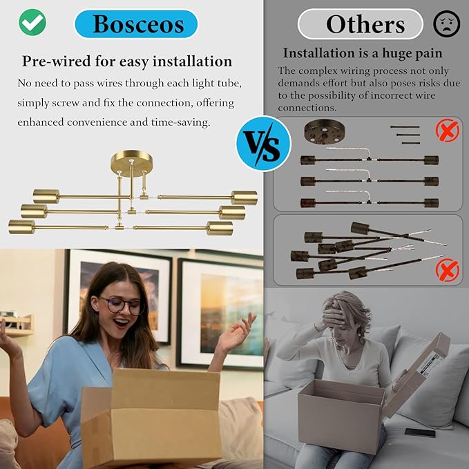 - 【Modern Sputnik Chandelier Decor your House】This semi flush mount ceiling light comes with sputnik style and modern geometric shape, combining the style of modern and retro. And this rustic ceiling lighting fits any home decor style, creating a comfortable and modern ambiance in your house. In addition, it is an ideal decorative lighting fixture for bedroom, dining room, living room, hallway, kitchen, beauty salon, bar, coffee house, etc.