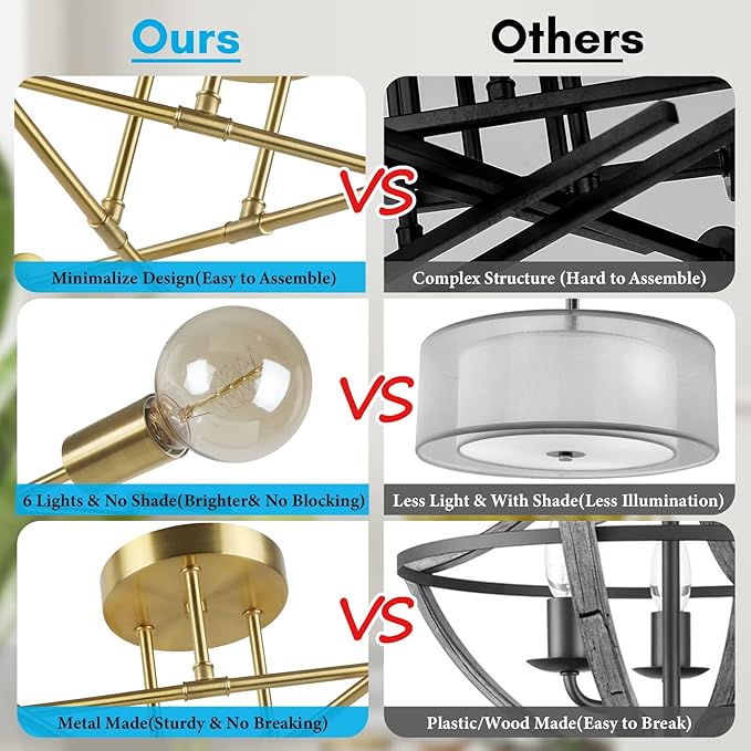 - 【6-Light Brighter Design & Adjustable & No Dark Corner】This farmhouse ceiling light fixture comes with 6 light bulb sockets, combining with open design, which will provide much more illumination to your place than those products with less lights. Moreover, adopting angle adjustable design, it allows you to adjust the direction of the light as you need, and it will light up every corner of your space while you are reading, watching TV, playing games or having fun with family or friends and so on.