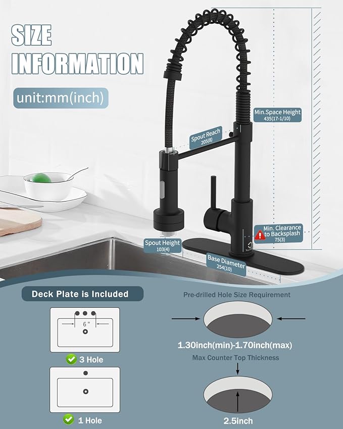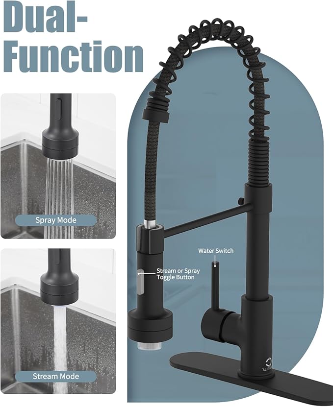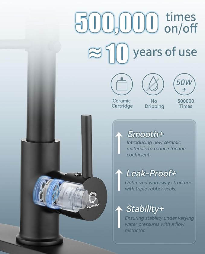- 【EASY MAINTENANCE】Lead-free solid brass body and commercial SUS 304 stainless steel spring construction forged products. Matte Black surface treatment added 18/8 Chromium/Nickel content provides a superior anti-corrosion and anti-rust finish that prevents dirt such as fingerprints or water stains from adhering to the faucet surface, making the kitchen look cleaner. Daily cleaning with a cloth or water is enough, less time cleaning and more time having fun with your family.