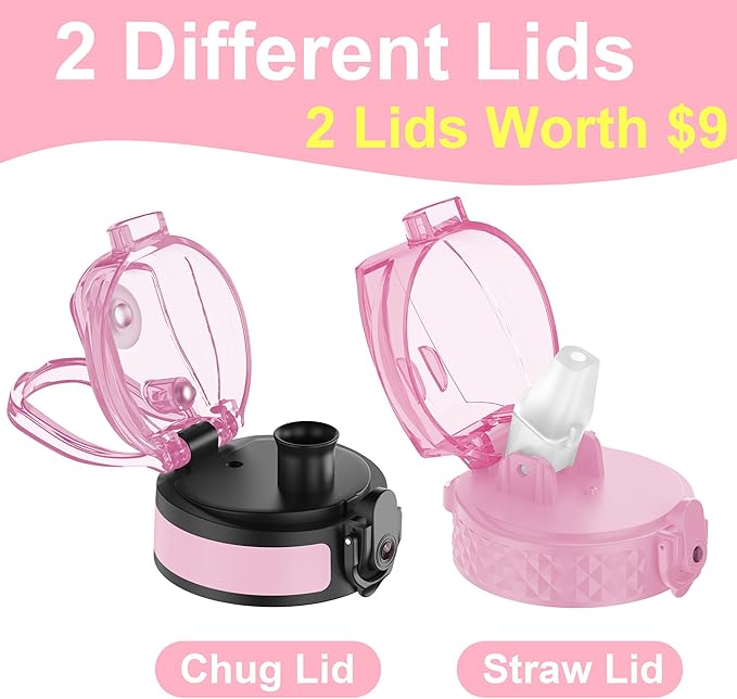 OLDLEY Water Bottle with Straw & Chug Lid for Kids Girls Child, 15 oz Leak-Proof BPA-Free Motivational Water Bottles with Time Marker for School Travel Sports Gym, 2 Lids, Candy Pink