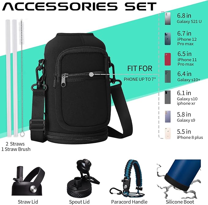 - PROTECTIVE BOOTS & STORAGE SLEEVE: Upgraded silicone boots prevent shattering and cracking when stainless steel water bottle accidental dropped. And storage carrying pouch with removable shoulder strap for convenient hands free carrying! The safe zippered pocket design to stores all your stuff, holds your cards & phone & key