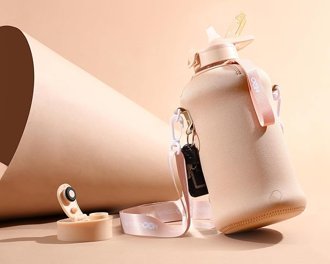 - UNIQUE STORAGE SLEEVE: Using the space under the large jug handle to store your stuff, the patent-pending removable thermal sleeve has a unique design that holds your cards and cell phone, and is finished with an in-built key chain and removable shoulder strap for convenient hands free carrying! It’s the only encased water jug that holds your things while you exercise.