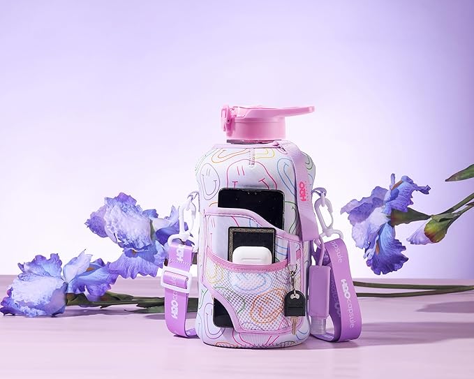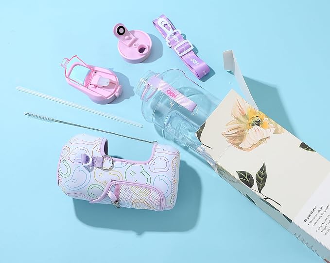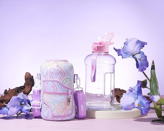 H2O Capsule 2.2L Half Gallon Water Bottle with Storage Sleeve and Removable Straw – BPA Free Large Reusable Drink Container with Handle - Big Sports Jug, 2.2 Liter (74 Ounce), Purple Smiley