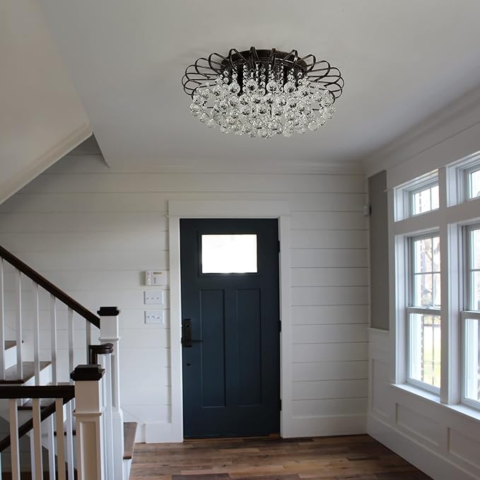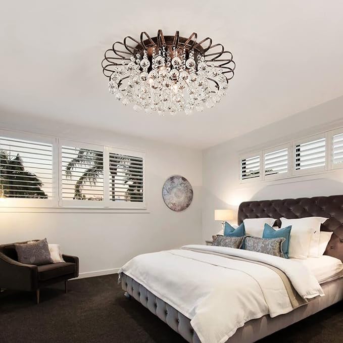 CVKASH 4-Light Crystal Floral Chandelier Modern Bronze Flush Mount Raindrop Crystal Ceiling Lighting Fixture Farmhouse Chandelier for Bathroom Living Room Bedroom Dining Room Entryway