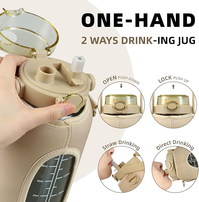 - Glass Water Bottle with Pop Up Lid : Our 42-64OZ glass water bottle with straw is designed with a pop up lid with silicone O-ring, secure lock & dust cover that ensures to be 100% leak-proof and dust-proof. This glass water bottle has two ways to drink water There's both a straw and a hole that can be drank from directly which is very convenient and fast