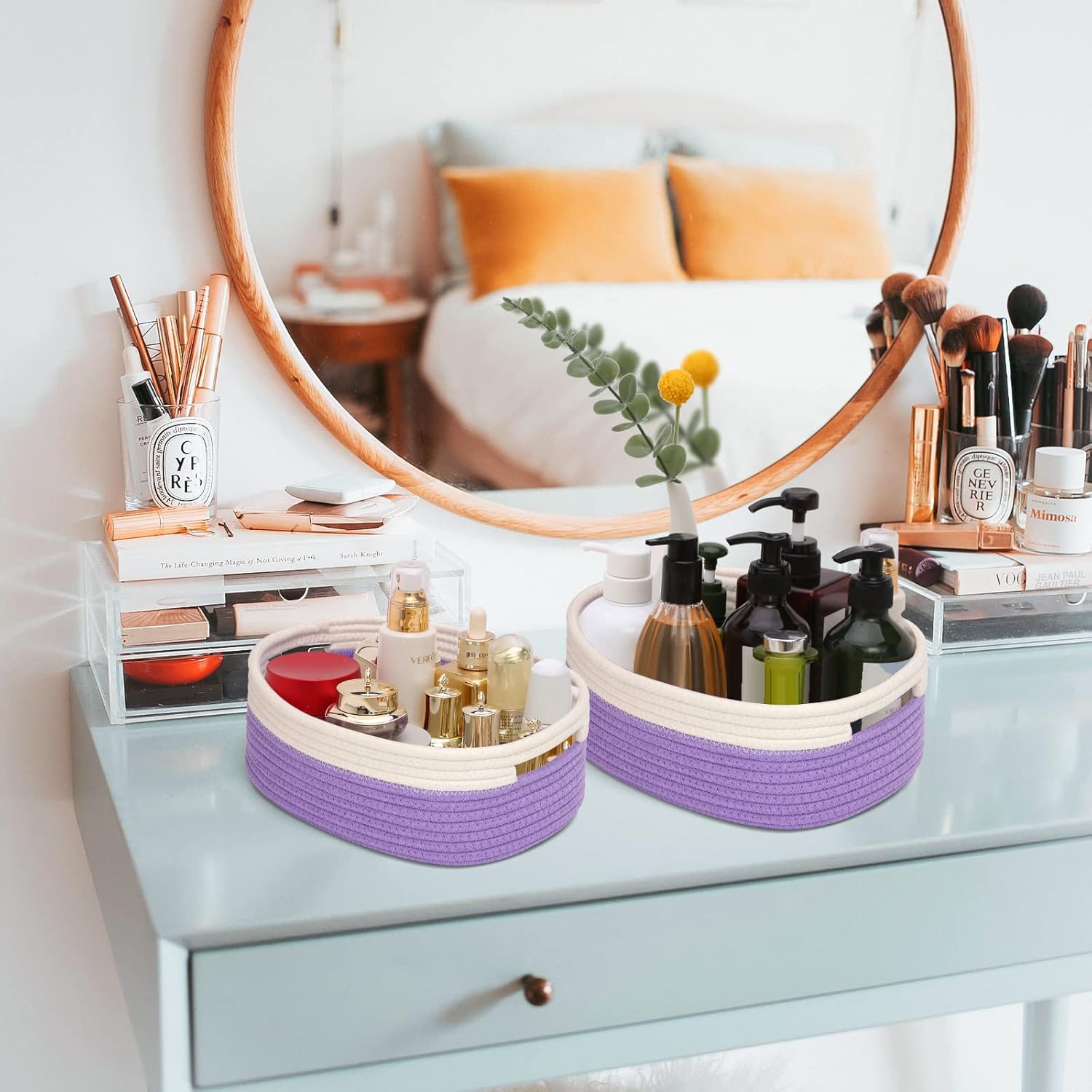 7 Piece Cotton Rope Woven Basket Set - Small Basket for Baby Nursery, Pets, Montessori, Dog & Cat Toy Boxes, Bathroom Organization Bins (White/Purple)