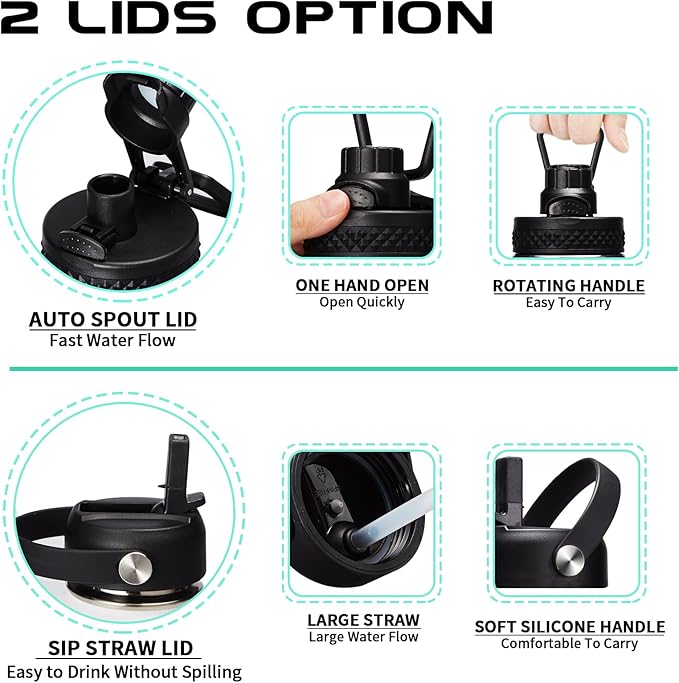 - 2 LID OPTIONS (Auto-spout & Straw): two different lids are complete LEAK PROOF & design for easy drink. The pops-up lid for easy drinking and seals shut for no leaks when you're on the go. The straw lid makes it easy to enjoy spill-proof sips, and package come with a alternative straw & a straw brush for easy cleaning