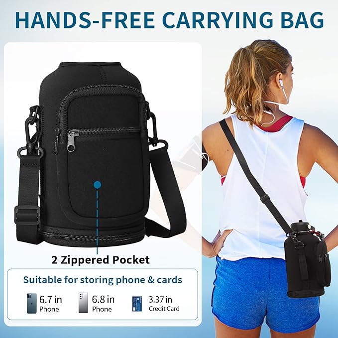 - HANDS-FREE BOTTLE CARRIER BAG & PROTECTIVE BOOT - Stainless steel water bottles with shoulder strap carrier have 2 zipper storage pockets hold your phone, cards, keys. The carrying pouch also provide extra insulation, with the silicone cup mat full-protect the reusable water bottle from additional damage and extend the life of thermo hydro mug