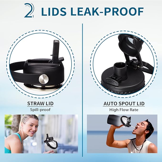 - LEAK-PROOF 2 LIDS - AUTO SPOUT LID & STRAW LID meet you different drinking need, and both lids are leak proof and with handle for carrying on the go. The pop-up spout lid features a button for one hand open quickly, and a large water outlet for fast drinking. The straw lid with straw lets you enjoy perfect spill-proof sipping to all your outdoor adventures, also can prevent the inhalation of ice cubes
