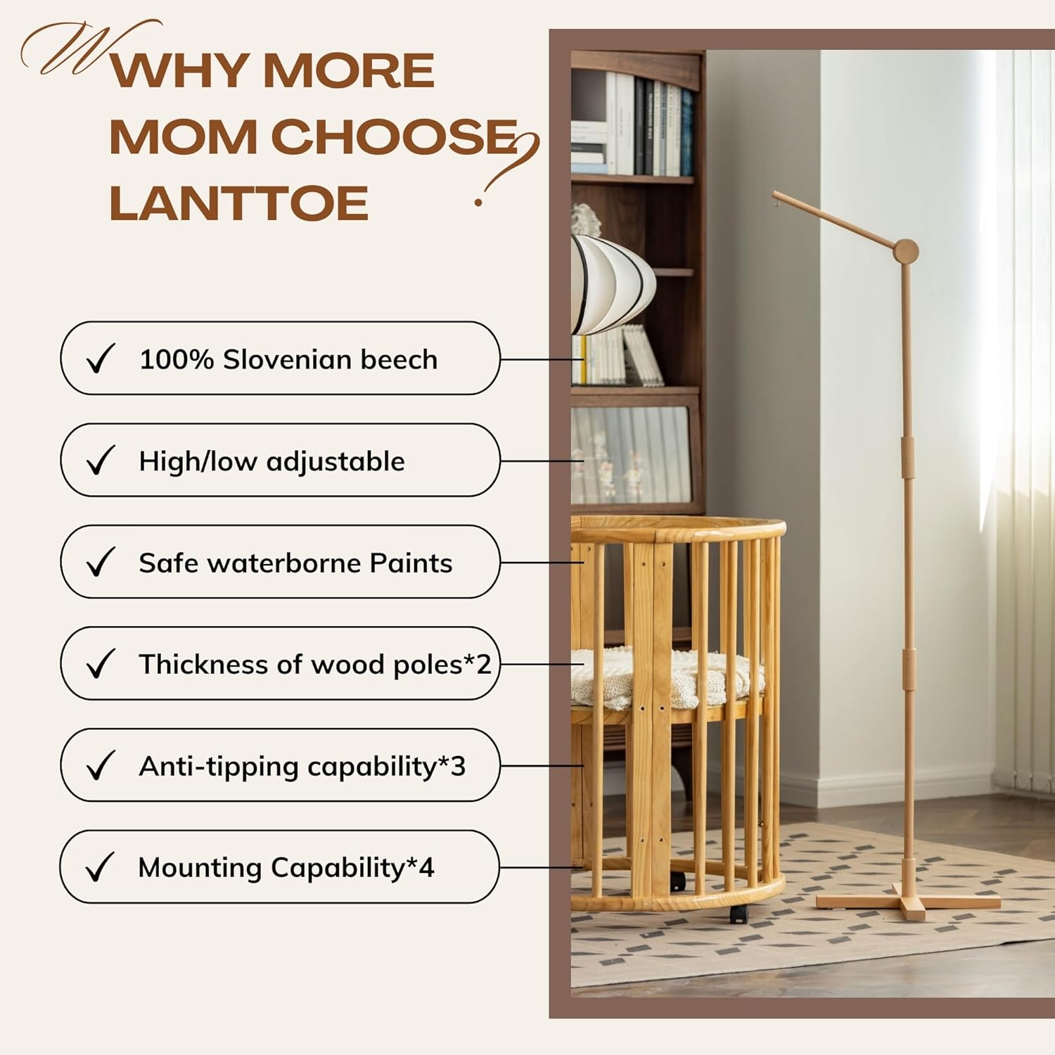 - 【European Beech Wood Only】The choice of 10,000+ mothers around the world, we import the best quality natural beech from Europe, all floor-standing mobile arm are made of safe water-based paint, designed by a professional baby product design team, to ensure that every product makes mothers rest assured and babies happy.