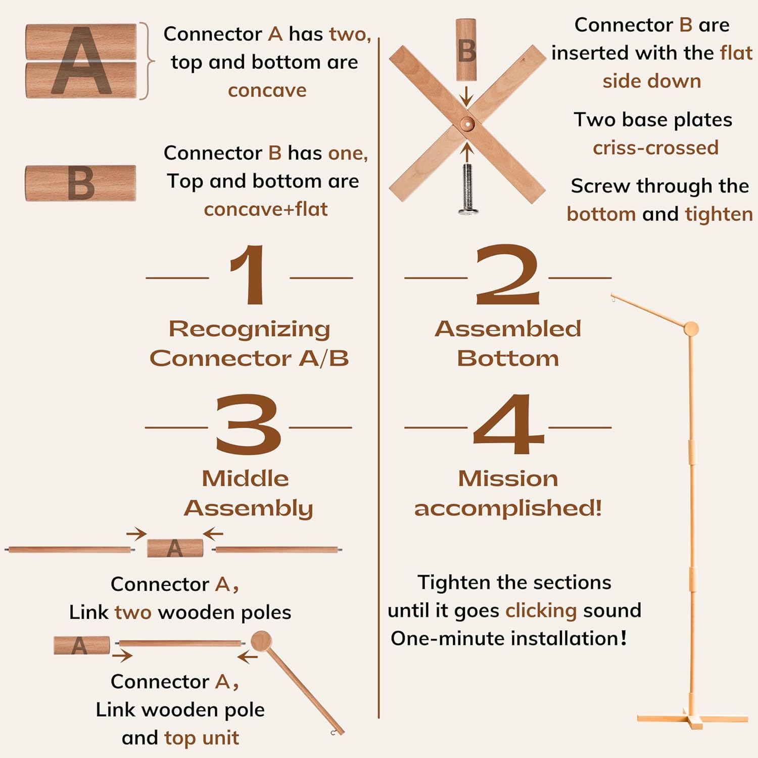 - 【Distinguish Connector A/B】In just one minute, you can easily assemble our products. All the rotating connections of the wooden poles, we recommend that you turn until the "gobble" sounds, so as to ensure the better use of our products,when not in use you can take them apart for compact storage.
