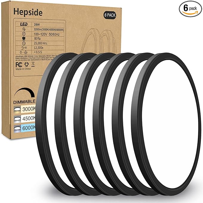 6PACK Flush Mount LED Ceiling Light Fixture Black, 12Inch 28Watt, Dimmable & 3000K-4500K-6000K 3 Color Selectable Ceiling Lamp 3200LM Low Profile Ceiling Light for Kitchen Bedroom Hallway Porch