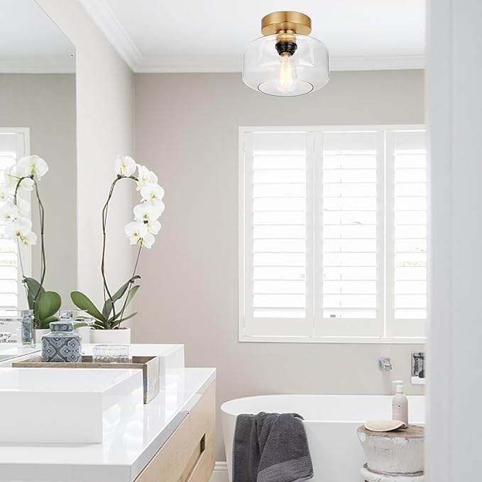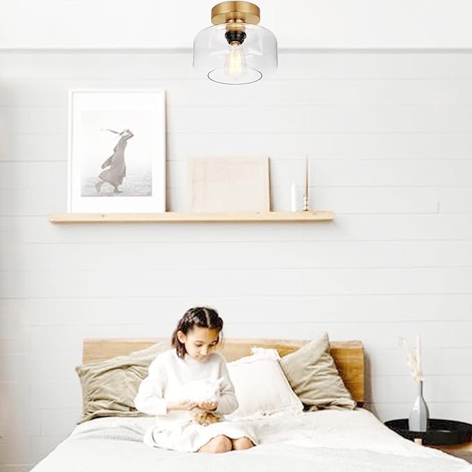 Industrial Semi Flush Mount Ceiling Light Brushed Gold, 800 Lumen LED Bulb Included, Clear Glass Shade Ceiling Light Fixture, Light Fixture for Hallway Bathroom Bedroom, Vintage Hanging Light Fixtures