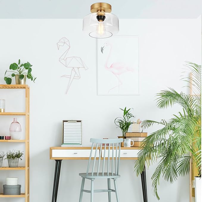 - Semi-Flush Mount Design & Classic Style: This brushed gold ceiling light is the perfect choice to complement your industrial/modern look. Its brushed gold base and impurity-free hand-blown clear glass with excellent light transmittance offer a modern interpretation of the classic urban industrial style.