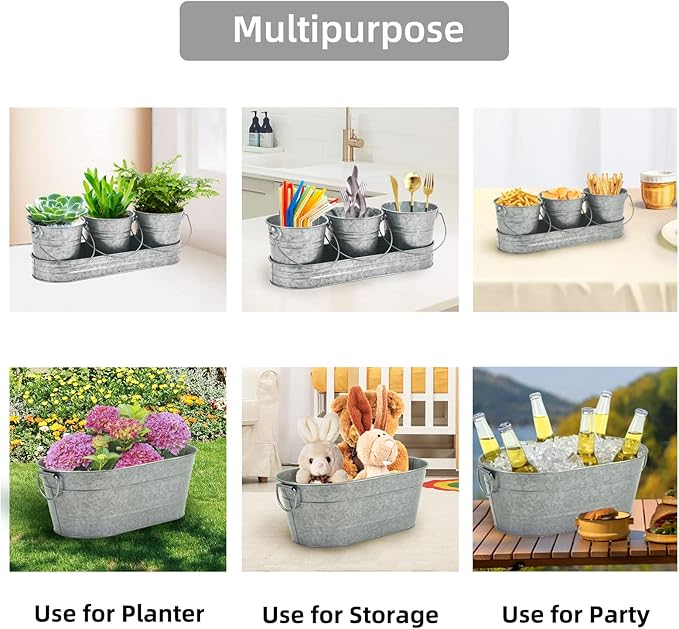 Oval Ice Bucket with 3 Serve Buckets Set-Condiments, Nuts, Ice Cream, Snacks, Galvanized Metal Drink Cooler Beverage Tub, Chill Wine & Beer, 2.4 for Home Parties Gallons, Galvanized