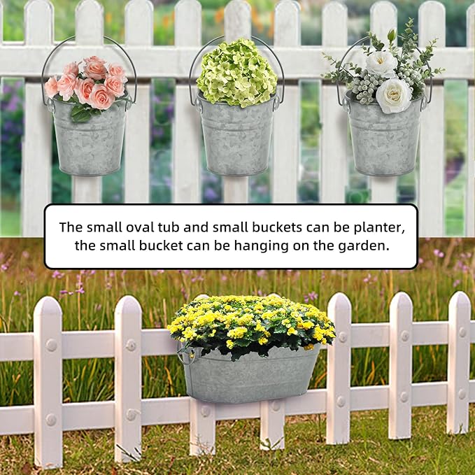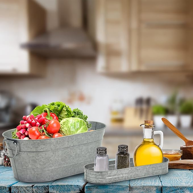 - DIMENSIONS - small oval tub: 15.86 X 9.21 X 6.02 INCH H(40.3X23.4X15.3CM);small oval tray: 13.97 X 4.72 X 1.77 INCH H(35.5 X 12 X 4.5CM);small bucket:DIA.4.5 X 4.3 INCH (11.4 X 11 CM) , The galvanized tub holds up to 2.4 gallons.
