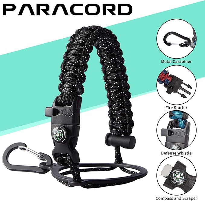 - UNIQUE DESIGNS PARACORD HANDLE: Full-function paracord handle made in individual styles to match the color of the flask water bottles. With compass, safety ring, carabiner, flint fire starter & whistle. It unravels into a sturdy and taut rope in an emergency, making the large water jug an ideal survival kit for expeditions in the wild