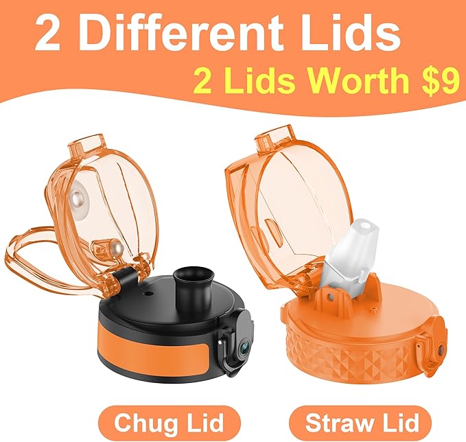 OLDLEY Kids Water Bottle for School with Straw Chug Lid, 15 oz Unbreakable Leak-Proof BPA-Free Motivational Water Bottles with Time Marker for Travel Sports Gym, 2 Lids, Orange/Green