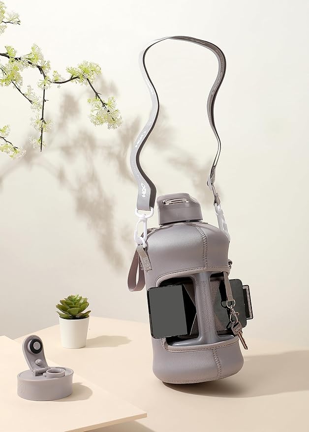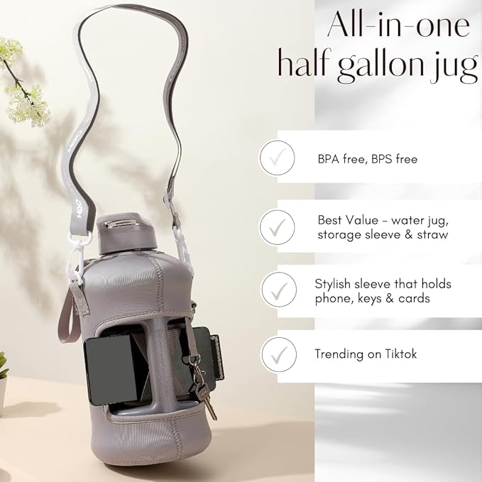 - UNIQUE STORAGE SLEEVE: Using the space under the large jug handle to store your stuff, the patent-pending removable thermal sleeve has a unique design that holds your cards and cell phone, and is finished with an in-built key chain and removable shoulder strap for convenient hands free carrying! It’s the only encased water jug that holds your things while you exercise.