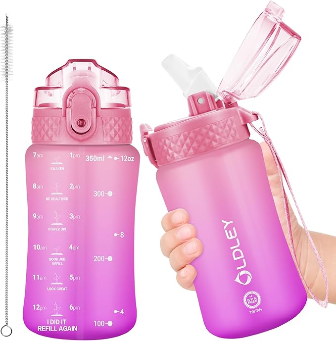 OLDLEY Kids Water Bottle for School, 12 oz (Straw Lid) BPA-Free Reusable Leak-proof Durable Tritan Plastic Water Bottles with One-handed Opening Straw Lids, Anti-dust Spout Cover (Sweet Pink)