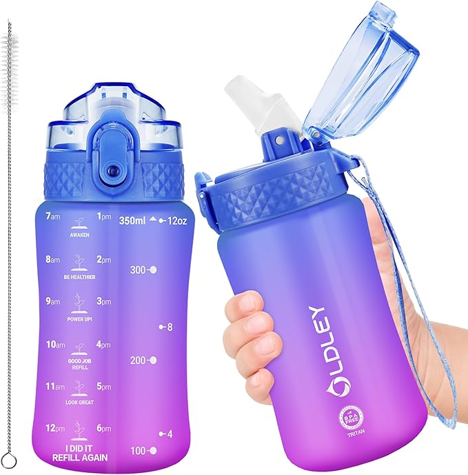 OLDLEY Kids Water Bottle for School, 12 oz (Straw Lid) BPA-Free Reusable Leak-proof Durable Tritan Plastic Water Bottles with One-handed Opening Straw Lids, Anti-dust Spout Cover (Lake)