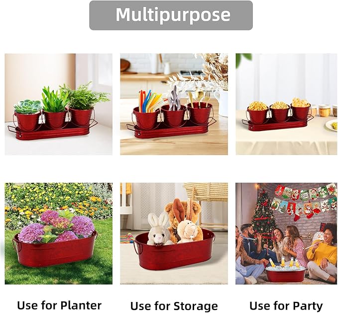 Oval Ice Bucket with 3 Serve Buckets Set - Condiments, Nuts, Ice Cream, Snacks, Candy Serving Bowls, Metal Drink Cooler Beverage Tub, Chill Wine & Beer, 4 Gallons for Home Parties, Red/Wire handle