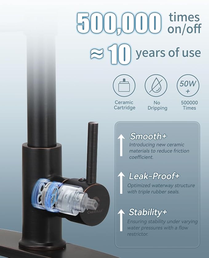 - 【EASY MAINTENANCE】Lead-free solid brass body and commercial SUS 304 stainless steel spring construction forged products. Oil Rubbed Bronze surface treatment added 18/8 Chromium/Nickel content provides a superior anti-corrosion and anti-rust finish that prevents dirt such as fingerprints or water stains from adhering to the faucet surface, making the kitchen look cleaner. Daily cleaning with a cloth or water is enough, less time cleaning and more time having fun with your family.