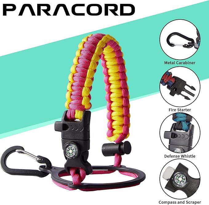 - UNIQUE DESIGNS PARACORD HANDLE: Full-function paracord handle made in individual styles to match the color of the flask water bottles. With compass, safety ring, carabiner & whistle. It unravels into a sturdy and taut rope in an emergency, making the large water jug an ideal survival kit for expeditions in the wild