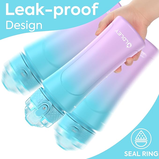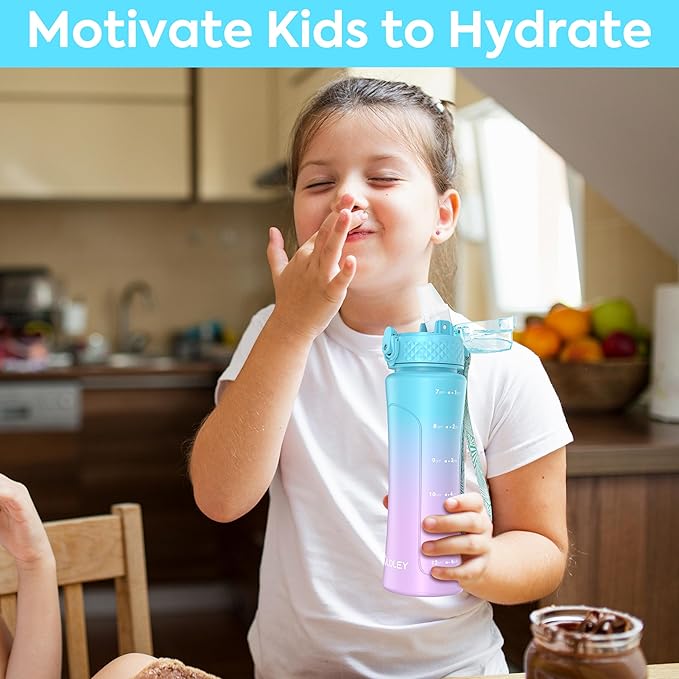 OLDLEY Kids Water Bottle for School with Straw Chug Lid, 15 oz Unbreakable Leak-Proof BPA-Free Motivational Water Bottles with Time Marker for Travel Sports Gym, Blue Purple