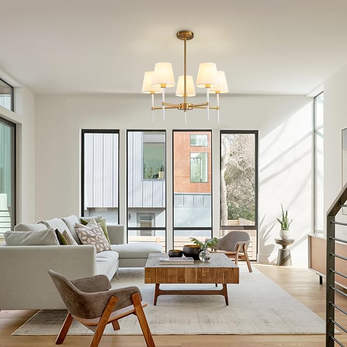 - High Quality Fabric Shade: This chandeliers for dining room has well-rubbed and anti-rust bushed gold finish in smooth texture will surely avoid any paint peeling problem, and will do better on the maintenance and preservation of the lamp body, enhance the timeless elegance. And the white fabric shade will spread evenly, relaxing and soft lighting, protecting your eyes and creating comfortable ambience