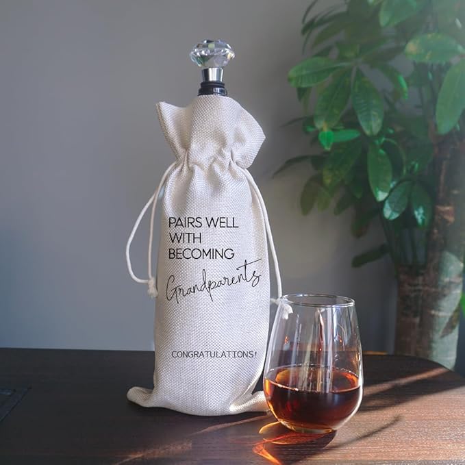 Pairs Well With Becoming Grandparent Linen Wine Gift Bag, Pregnancy Reveal Pregnancy Announcement Baby Shower Wine Bags for Wine Bottles, 1 Pack Reusable Burlap Wine Bag-2