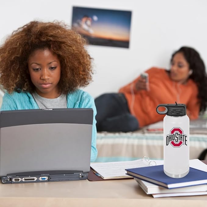 Ohio State University 32oz Stainless Steel Double Walled White Beverage Bottle with Flip Straw Spout - College Gear for Playoff Season – For Office, Home or Auto – Show your Buckeye Pride